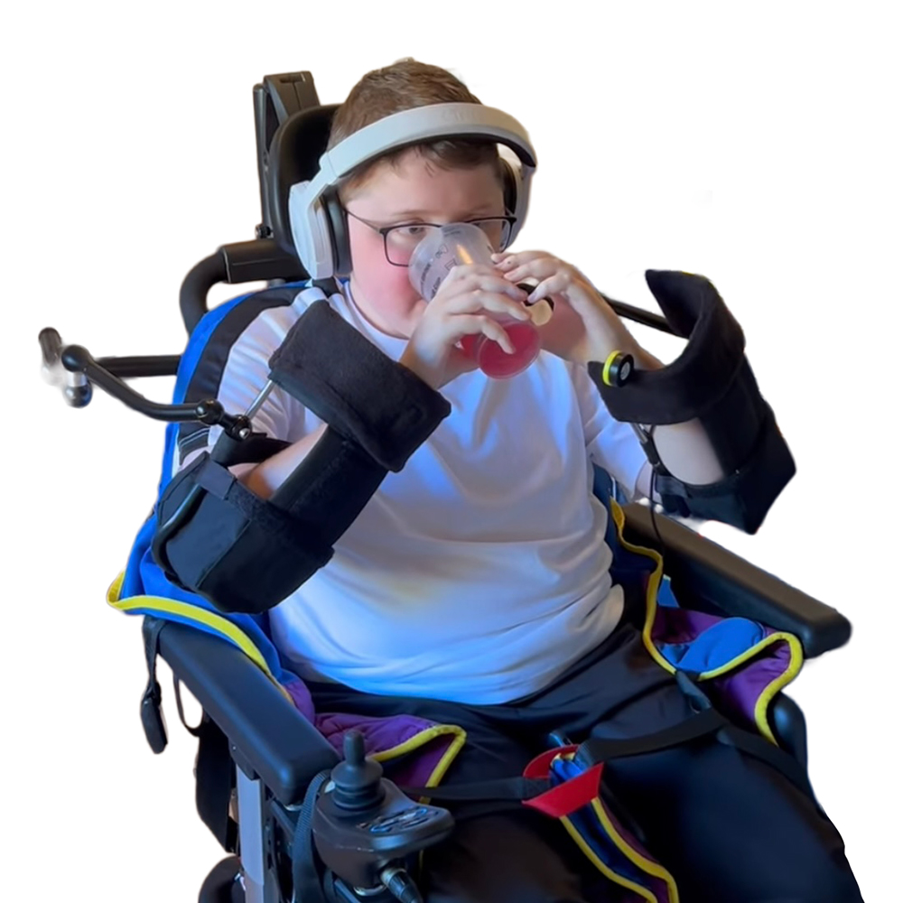 The unique power‑drive system lifts and supports the user's arm with minimal effort, countering gravity to enable essential tasks like feeding, phone use, and computer access.
